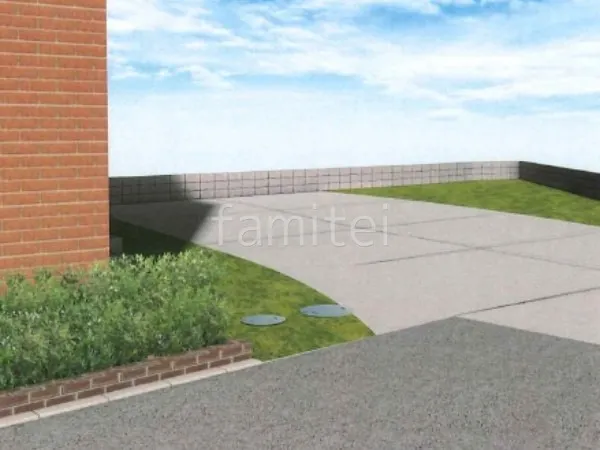 駐車スペースは耐久性に優れた土間コンクリート仕上げとし、日常の車の出入りに安心感を持たせました。 周囲には天然芝を敷き詰め、緑豊かな景観と柔らかな足触りを楽しめる空間を演出しています。 お庭スペースにはタイルデッキを設け、1台用カーポート YKKAP エフルージュFIRSTをテラス屋根代わりに活用し、雨天時でも快適に過ごせる半屋外空間に仕上げました。