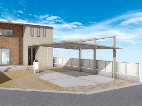 駐車スペース全体を土間コンクリートと乱形石で仕上げ、耐久性を確保しつつも華やかさと高級感のある印象に仕上げました。 さらに、2台用カーポート 三協アルミ ダブルフェース 側面支持を設置し、柱が片側にしかない構造で車の出入りをスムーズにし、駐車スペースを広く有効に活用できるようになりました。